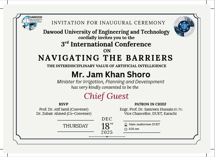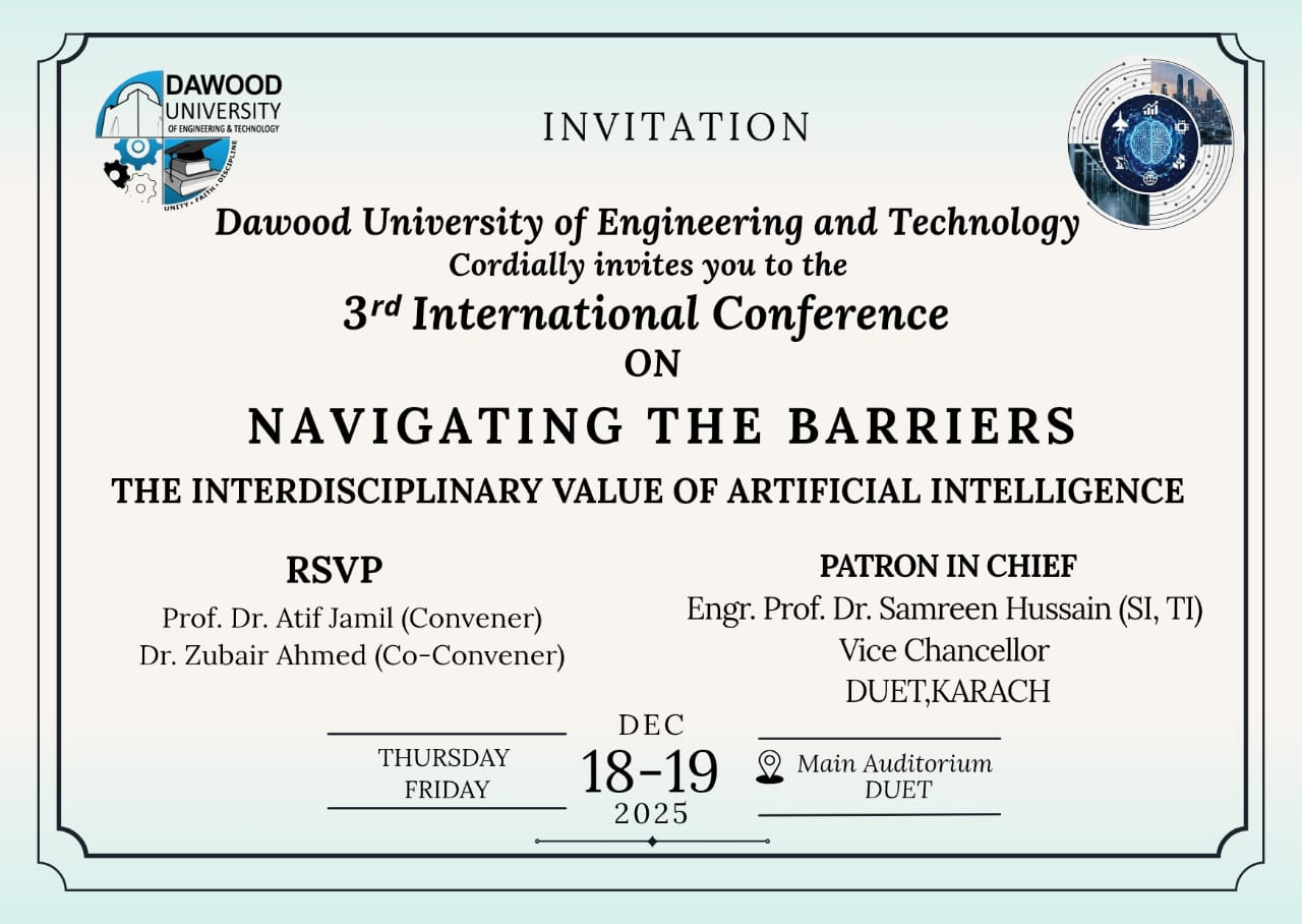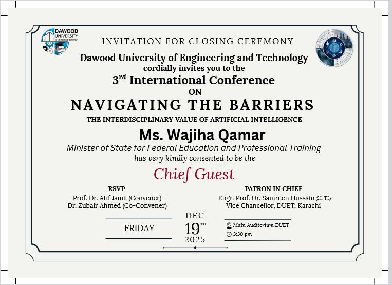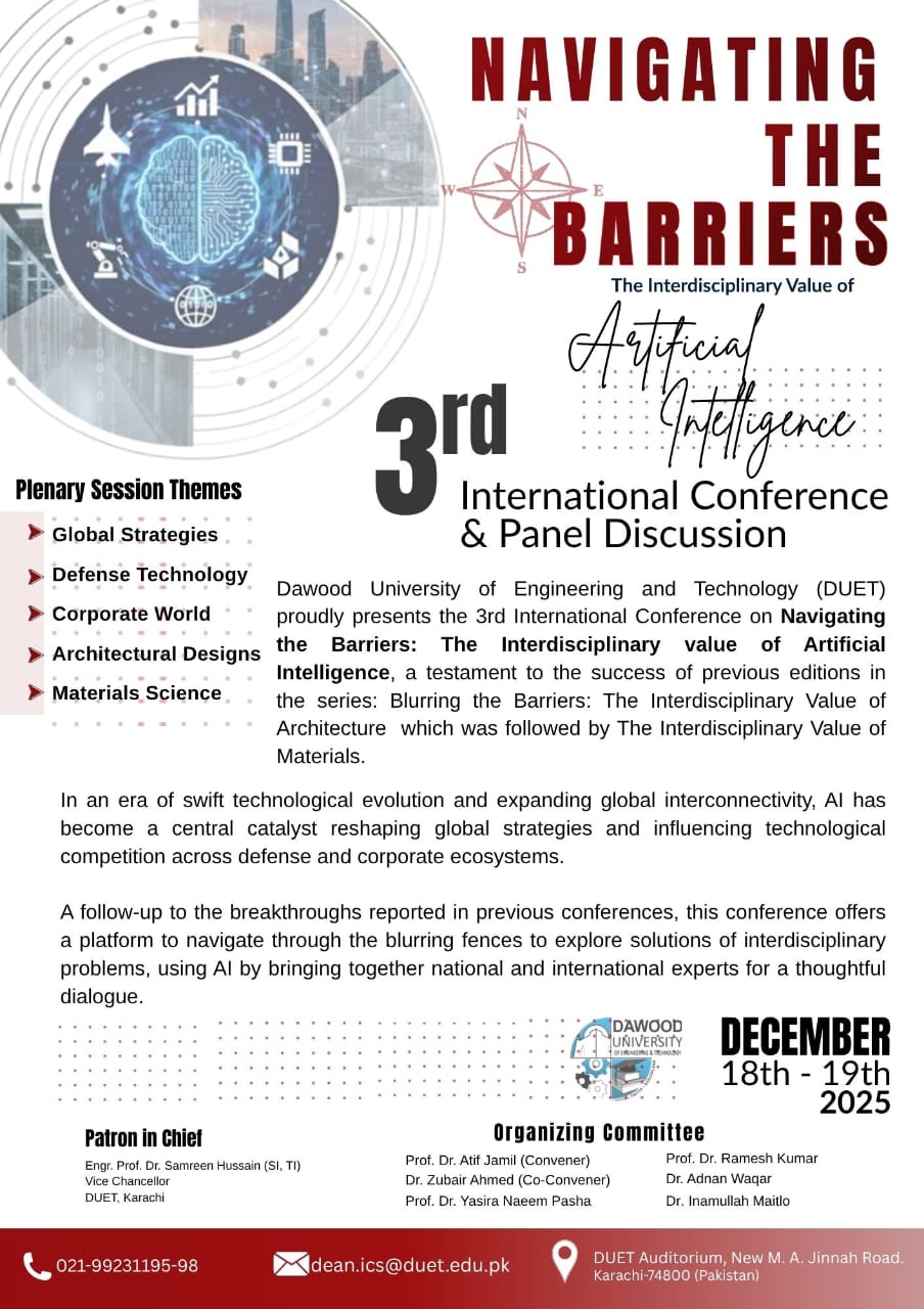 On behalf of the organizing committee, it is a pleasure and an honor to welcome you all to the 3rd International Conference on Navigating the Barriers: The Interdisciplinary Value of Artificial Intelligence. This conference, scheduled for December 18-19, 2025, under the visionary leadership of the Worthy Vice Chancellor of DUET, reflects our collective dedication to advancing knowledge and innovation in the field of Artificial Intelligence and beyond.